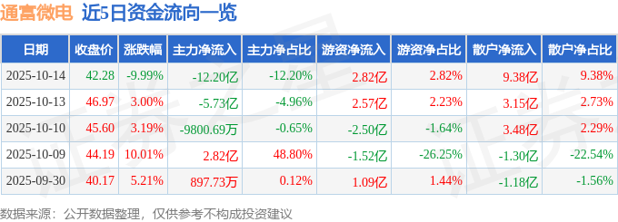 证券之星消息,截至2025年10月14日收盘,通富微电(002156)报收于42.28元,下跌9.99%,换手率14.92%,成交量226.36万手,成交额100.0亿元。
