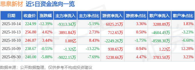 证券之星消息,截至2025年10月14日收盘,思泉新材(301489)报收于224.99元,下跌12.39%,换手率16.14%,成交量7.68万手,成交额17.95亿元。