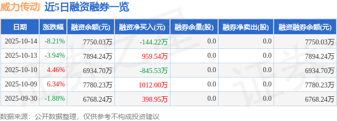 威力传动融资融券信息显示,融资方面,当日融资买入3364.51万元,融资偿还3508.72万元,融资净偿还144.22万元。融券方面,融券卖出0.0股,融券偿还0.0股,融券余量0.0股,融券余额0.0万元。融资融券余额7750.03万元。