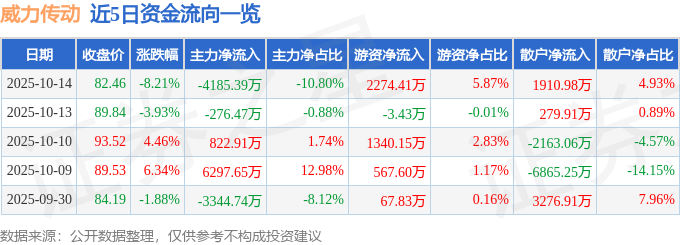 证券之星消息,截至2025年10月14日收盘,威力传动(300904)报收于82.46元,下跌8.21%,换手率19.69%,成交量4.33万手,成交额3.87亿元。