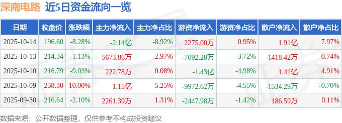 证券之星消息,截至2025年10月14日收盘,深南电路(002916)报收于196.6元,下跌8.28%,换手率1.77%,成交量11.77万手,成交额23.95亿元。