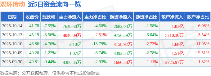 证券之星消息,截至2025年10月14日收盘,双环传动(002472)报收于41.78元,下跌7.55%,换手率5.2%,成交量39.22万手,成交额16.99亿元。