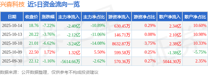 证券之星消息,截至2025年10月14日收盘,兴森科技(002436)报收于18.76元,下跌7.22%,换手率7.55%,成交量114.07万手,成交额22.07亿元。