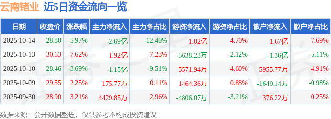 证券之星消息,截至2025年10月14日收盘,云南锗业(002428)报收于28.8元,下跌5.97%,换手率11.25%,成交量73.46万手,成交额21.73亿元。