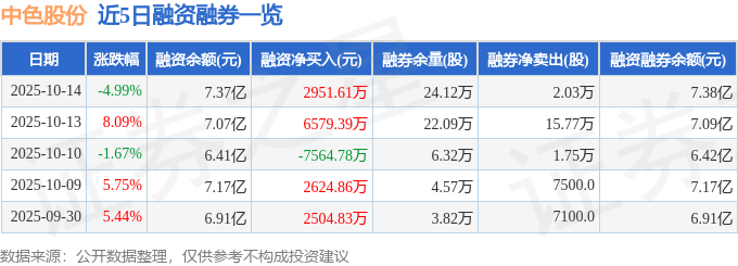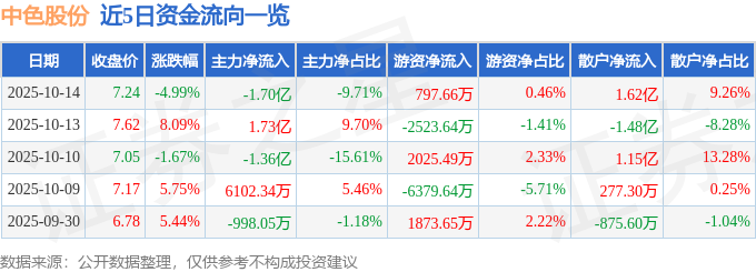 证券之星消息,截至2025年10月14日收盘,中色股份(000758)报收于7.24元,下跌4.99%,换手率11.75%,成交量232.27万手,成交额17.51亿元。