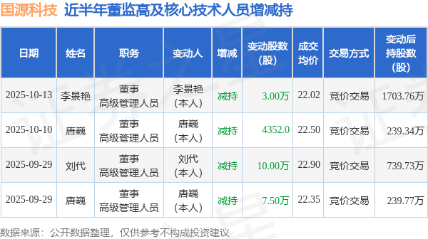 国源科技近半年内的董监高及核心技术人员增减持详情如下: