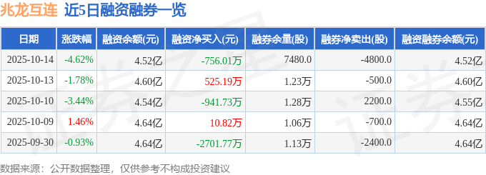 兆龙互连融资融券信息显示,融资方面,当日融资买入3565.31万元,融资偿还4321.32万元,融资净偿还756.01万元。融券方面,融券卖出400.0股,融券偿还5200.0股,融券余量7480.0股,融券余额38.58万元。融资融券余额4.52亿元。