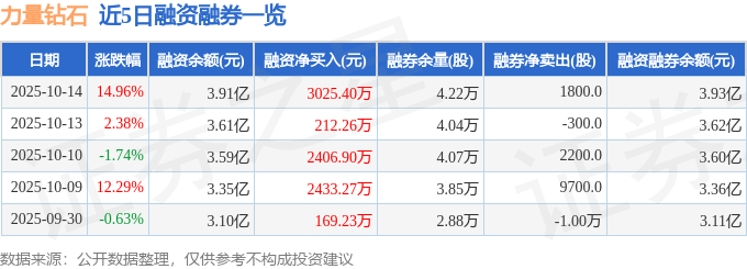 证券之星消息,截至2025年10月14日收盘,力量钻石(301071)报收于41.1元,上涨14.97%,换手率23.72%,成交量46.15万手,成交额18.37亿元。