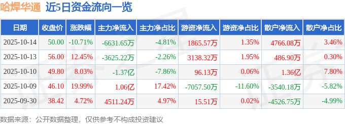 证券之星消息,截至2025年10月14日收盘,哈焊华通(301137)报收于50.0元,下跌10.71%,换手率14.5%,成交量26.13万手,成交额13.78亿元。