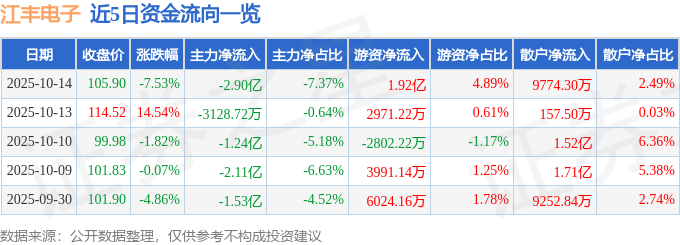 10月14日的资金流向数据方面,主力资金净流出2.9亿元,占总成交额7.37%,游资资金净流入1.92亿元,占总成交额4.89%,散户资金净流入9774.3万元,占总成交额2.49%。