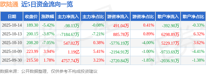 证券之星消息,截至2025年10月14日收盘,欧陆通(300870)报收于189.3元,下跌5.42%,换手率5.52%,成交量6.07万手,成交额12.04亿元。
