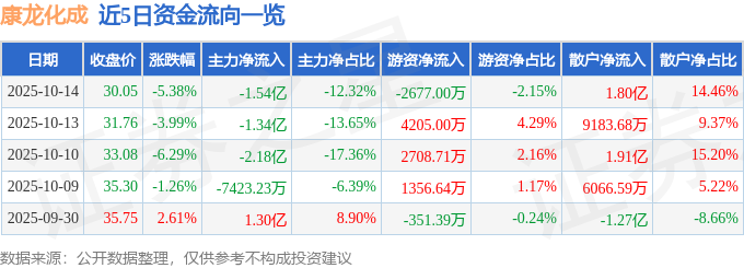 证券之星消息,截至2025年10月14日收盘,康龙化成(300759)报收于30.05元,下跌5.38%,换手率2.84%,成交量40.28万手,成交额12.48亿元。