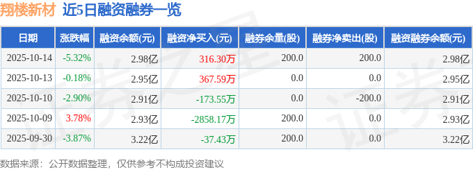 翔楼新材融资融券信息显示,融资方面,当日融资买入2070.67万元,融资偿还1754.37万元,融资净买入316.3万元。融券方面,融券卖出200.0股,融券偿还0.0股,融券余量200.0股,融券余额1.14万元。融资融券余额2.98亿元。