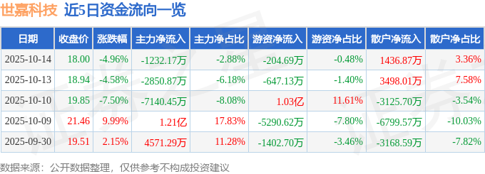 证券之星消息,截至2025年10月14日收盘,世嘉科技(002796)报收于18.0元,下跌4.96%,换手率10.18%,成交量22.97万手,成交额4.27亿元。