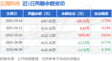证券之星消息,10月14日,云涌科技(688060)融资买入563.37万元,融资偿还327.08万元,融资净买入236.29万元,融资余额4367.85万元。