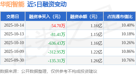 证券之星消息,10月14日,华阳智能(301502)融资买入283.36万元,融资偿还228.66万元,融资净买入54.7万元,融资余额1.16亿元。
