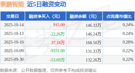 证券之星消息,10月14日,泰鹏智能(920132)融资买入24.58万元,融资偿还24.49万元,融资净买入0.09万元,融资余额146.33万元。