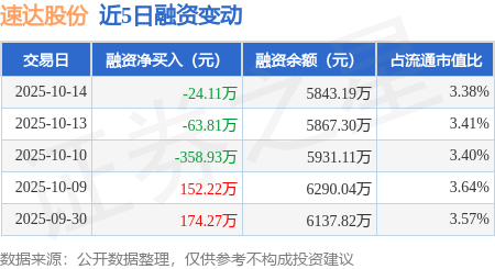 证券之星消息,10月14日,速达股份(001277)融资买入235.58万元,融资偿还259.69万元,融资净卖出24.11万元,融资余额5843.19万元。