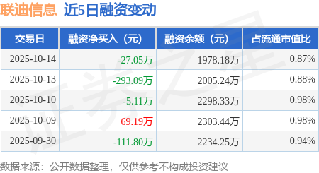 证券之星消息,10月14日,联迪信息(920790)融资买入86.15万元,融资偿还113.21万元,融资净卖出27.05万元,融资余额1978.18万元。