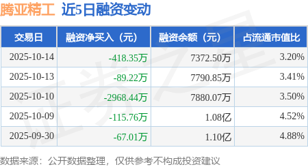 证券之星消息,10月14日,腾亚精工(301125)融资买入1871.33万元,融资偿还2289.68万元,融资净卖出418.35万元,融资余额7372.5万元。