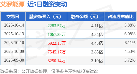 证券之星消息,10月14日,艾罗能源(688717)融资买入5306.94万元,融资偿还7590.51万元,融资净卖出2283.57万元,融资余额4.11亿元。