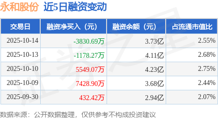 证券之星消息,10月14日,永和股份(605020)融资买入9732.27万元,融资偿还1.36亿元,融资净卖出3830.69万元,融资余额3.73亿元,近20个交易日中有13个交易日出现融资净买入。