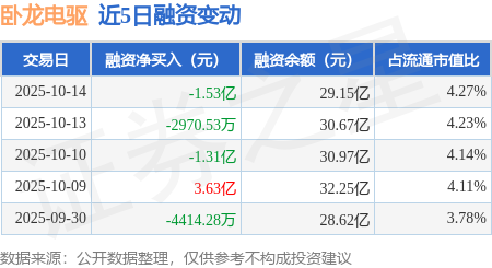证券之星消息,10月14日,卧龙电驱(600580)融资买入4.62亿元,融资偿还6.15亿元,融资净卖出1.53亿元,融资余额29.15亿元。