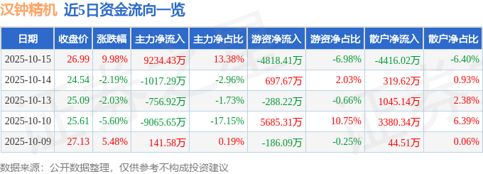 10月15日的资金流向数据方面,主力资金净流入9234.43万元,占总成交额13.38%,游资资金净流出4818.41万元,占总成交额6.98%,散户资金净流出4416.02万元,占总成交额6.4%。