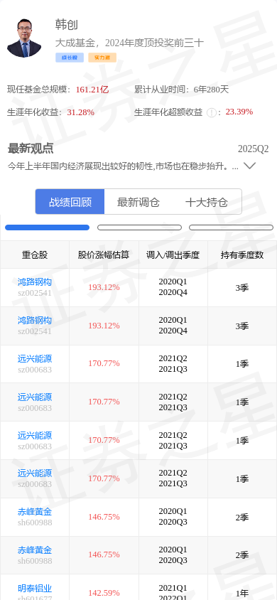 紫金矿业(601899)是基金大佬韩创的重仓股。,其在整个职业生涯内年化收益高达31.28%。韩创管理的大成睿景灵活配置混合A基金在2020年3季度调入紫金矿业,在持有3个季度后在2021年2季度调出,持有期间的估算收益率达到62.91%。(以上数据经过后复权近似计算)韩创的大佬持仓 - 战绩回顾截图如下: