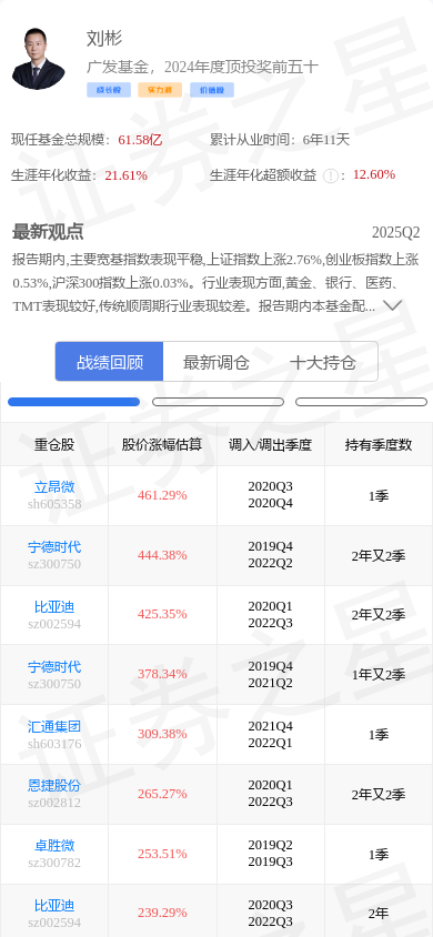 亨通光电(600487)是基金经理刘彬的重仓股。,其在整个职业生涯内年化收益高达21.61%。刘彬的大佬持仓 - 战绩回顾截图如下: