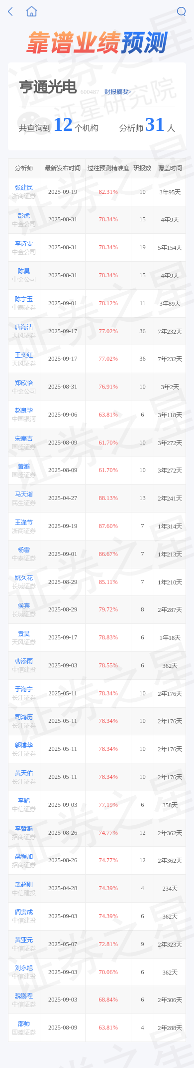 如果您对这家公司感兴趣,可以参考证星研究院统计的亨通光电的分析师业绩预测数据,其中根据浙商证券的分析师张建民预测公司未来PE为12.0(更多特色估值数据尽在证星研究院,所有数据均来源公开资料,期且所有资料都存在一定时间滞后,所有相关数据均不可作为投资决策单一依据)。