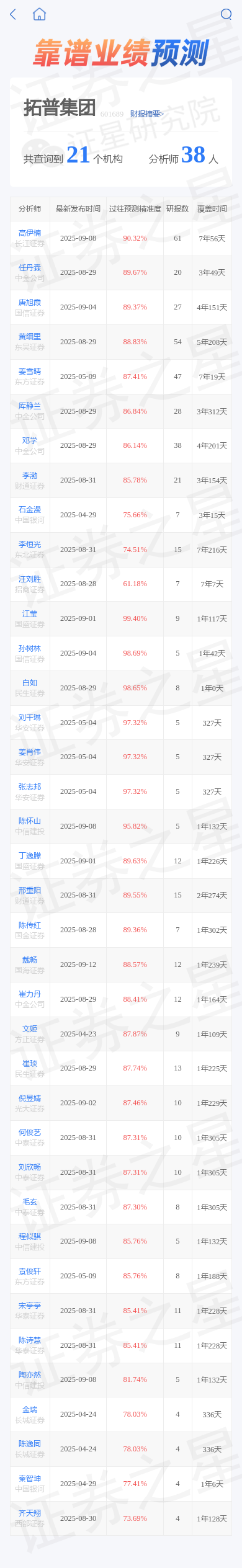 如果您对这家公司感兴趣,可以参考证星研究院统计的拓普集团的分析师业绩预测数据,其中根据长江证券的分析师高伊楠预测公司未来PE为25.0(更多特色估值数据尽在证星研究院,所有数据均来源公开资料,期且所有资料都存在一定时间滞后,所有相关数据均不可作为投资决策单一依据)。