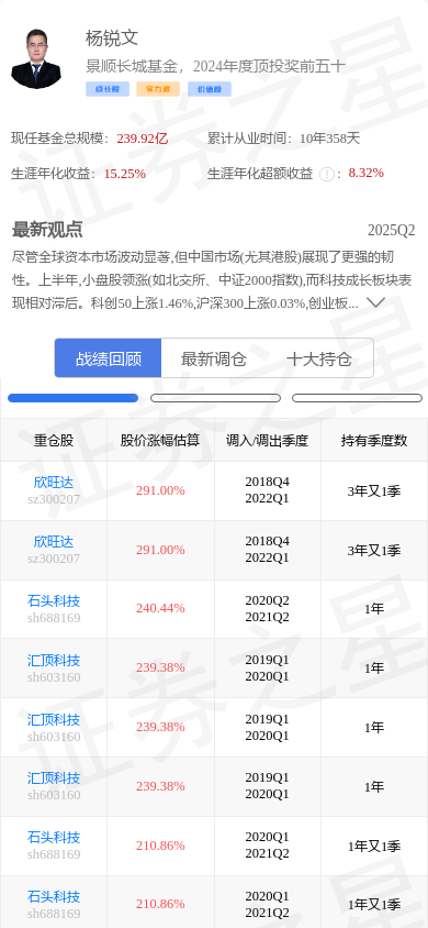 爱旭股份(600732)是基金经理杨锐文的重仓股。,其在整个职业生涯内年化收益高达15.25%。杨锐文的大佬持仓 - 战绩回顾截图如下: