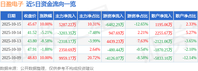 证券之星消息,截至2025年10月15日收盘,日盈电子(603286)报收于45.67元,上涨10.0%,涨停,换手率10.05%,成交量11.6万手,成交额5.13亿元。