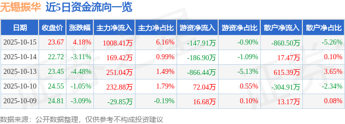 证券之星消息,截至2025年10月15日收盘,无锡振华(605319)报收于23.67元,上涨4.18%,换手率2.34%,成交量7.0万手,成交额1.64亿元。