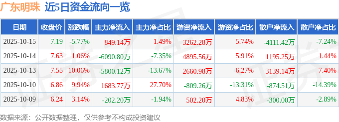 证券之星消息,截至2025年10月15日收盘,广东明珠(600382)报收于7.19元,下跌5.77%,换手率11.52%,成交量79.99万手,成交额5.68亿元。