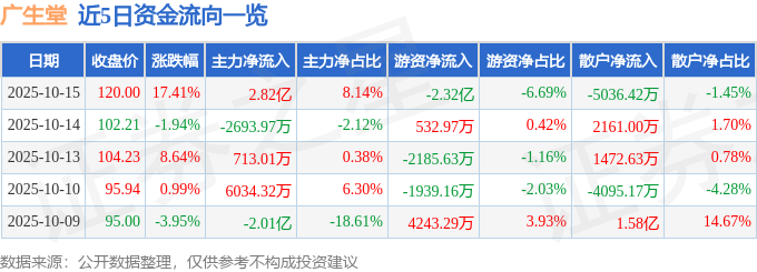 证券之星消息,截至2025年10月15日收盘,广生堂(300436)报收于120.0元,上涨17.41%,换手率21.83%,成交量29.85万手,成交额34.67亿元。