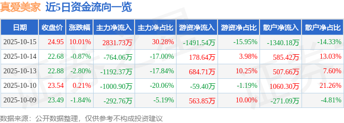证券之星消息,截至2025年10月15日收盘,真爱美家(003041)报收于24.95元,上涨10.01%,涨停,换手率2.77%,成交量3.79万手,成交额9351.44万元。