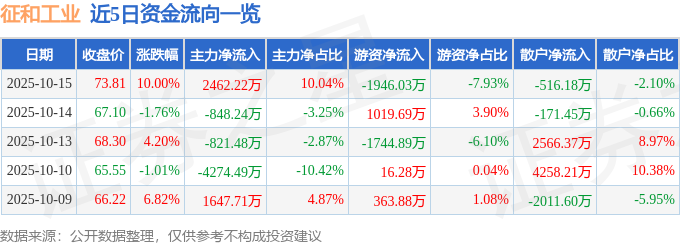 证券之星消息,截至2025年10月15日收盘,征和工业(003033)报收于73.81元,上涨10.0%,涨停,换手率4.24%,成交量3.43万手,成交额2.45亿元。