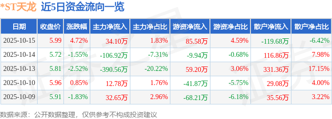 证券之星消息,截至2025年10月15日收盘,*ST天龙(300029)报收于5.99元,上涨4.72%,换手率1.59%,成交量3.19万手,成交额1865.23万元。