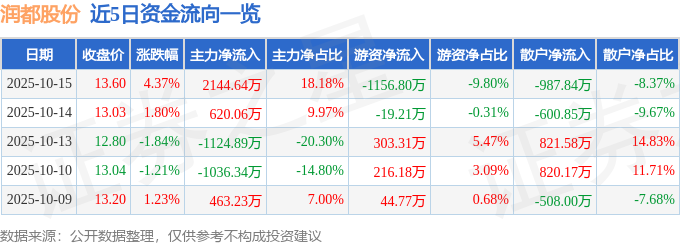 证券之星消息,截至2025年10月15日收盘,润都股份(002923)报收于13.6元,上涨4.37%,换手率3.4%,成交量8.78万手,成交额1.18亿元。