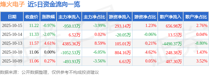 证券之星消息,截至2025年10月15日收盘,烽火电子(000561)报收于11.22元,下跌0.97%,换手率3.56%,成交量21.45万手,成交额2.38亿元。