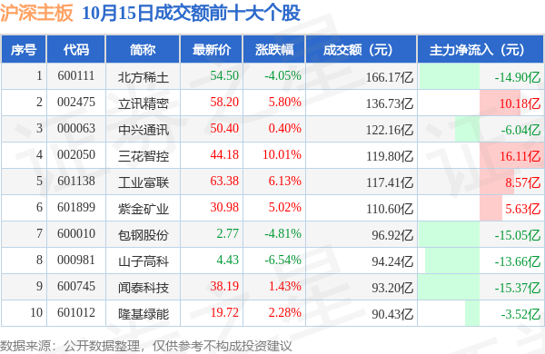 当日沪深主板成交额前10大个股中7只个股收涨,平均涨幅4.44%,其中北方稀土(600111)以成交额166.17亿元排第一。从主力资金流入看,成交额前10大个股中有4只个股呈现主力资金净流入。