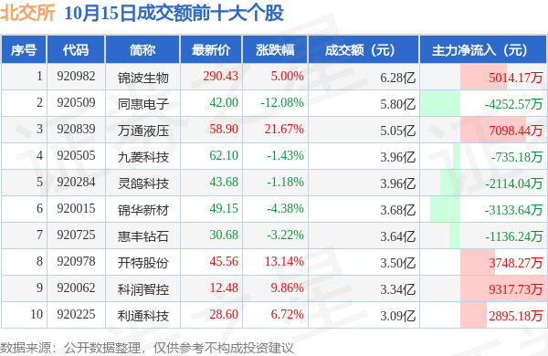 当日北交所成交额前10大个股中5只个股收涨,平均涨幅11.28%,其中锦波生物(920982)以成交额6.28亿元排第一。从主力资金流入看,成交额前10大个股中有5只个股呈现主力资金净流入。