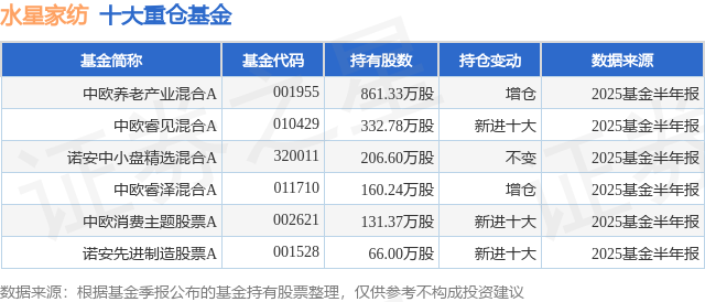根据2025基金半年报公募基金重仓股数据,重仓该股的公募基金共6家,其中持有数量最多的公募基金为中欧基金的中欧养老产业混合A。中欧养老产业混合A目前规模为18.66亿元,最新净值2.9073(10月14日),较上一交易日上涨0.52%,近一年上涨11.7%。该公募基金现任基金经理为许文星。许文星在任的基金产品包括:中欧创业板两年定开混合A,管理时间为2020年7月16日至今,期间收益率为-4.02%;中欧睿见混合A,管理时间为2020年11月6日至今,期间收益率为-9.98%;中欧睿泽混合A,管理时间为2021年9月23日至今,期间收益率为-26.65%。