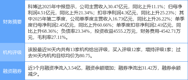 2025年9月5日,民生证券研究员崔琰,白如发布了对科博达的研报《系列点评五:智驾子公司收购 新产品、新客户持续突破》,该研报对科博达给出“买入”评级。研报中预计2025-2027年营收为78.7/98.6/122.0亿元,归母净利为10.5/13.4/17.1亿元,EPS为2.61/3.32/4.24元,对应2025年9月4日55.7元/股收盘价,PE为21/17/13倍,维持“推荐”评级。证券之星数据中心根据近三年发布的研报数据计算,该研报作者对此股的盈利预测准确度为88.47%。