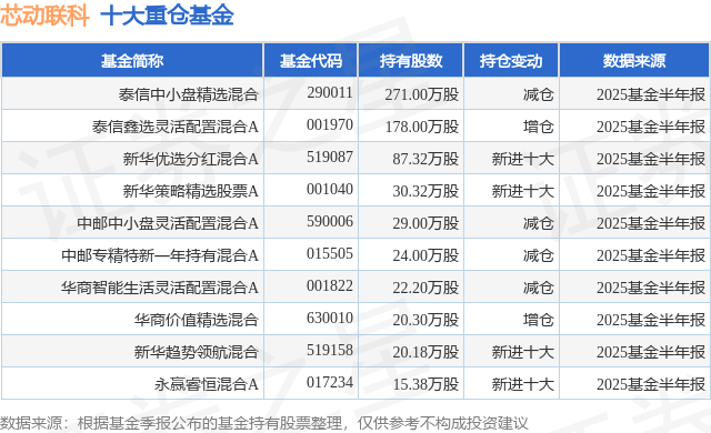 根据2025基金半年报公募基金重仓股数据,重仓该股的公募基金共26家,其中持有数量最多的公募基金为泰信基金的泰信中小盘精选混合。泰信中小盘精选混合目前规模为18.36亿元,最新净值4.439(10月14日),较上一交易日下跌3.14%,近一年上涨66.19%。该公募基金现任基金经理为董季周。董季周在任的基金产品包括:泰信鑫选灵活配置混合A,管理时间为2020年11月24日至今,期间收益率为17.66%。