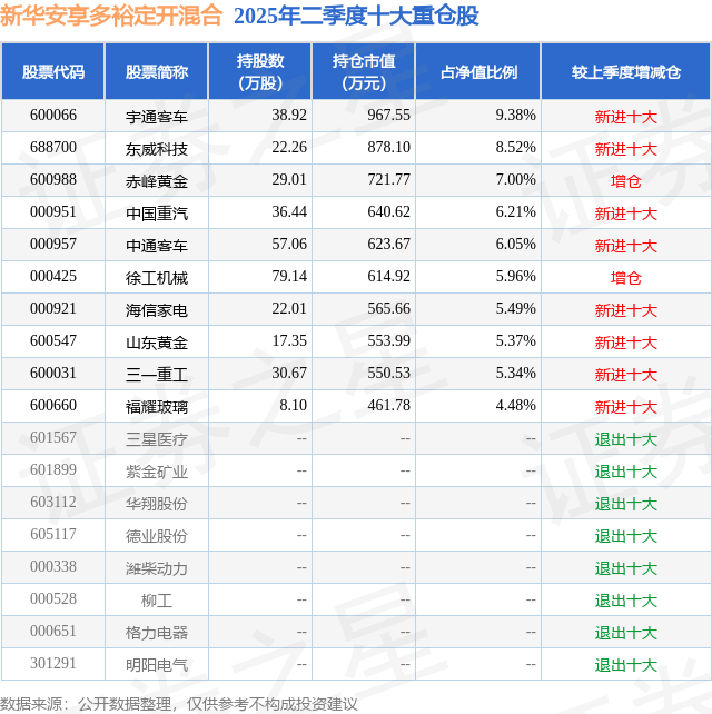 根据2025基金半年报公募基金重仓股数据,重仓该股的公募基金共1家,其中持有数量最多的公募基金为新华基金的新华安享多裕定开混合。新华安享多裕定开混合目前规模为1.03亿元,最新净值1.2035(10月10日),较上一交易日下跌0.43%,近一年上涨41.34%。该公募基金现任基金经理为赵强 姚海明 侯淳。赵强在任的基金产品包括:新华策略精选股票A,管理时间为2017年5月17日至今,期间收益率为170.96%;新华优选分红混合A,管理时间为2017年5月17日至今,期间收益率为135.49%;新华趋势领航混合,管理时间为2022年10月25日至今,期间收益率为2.34%。姚海明在任的基金产品包括:新华聚利债券A,管理时间为2020年11月27日至今,期间收益率为10.86%;新华红利回报混合,管理时间为2021年12月30日至今,期间收益率为6.51%;新华安享惠融88个月定开债A,管理时间为2024年10月28日至今,期间收益率为4.29%。
