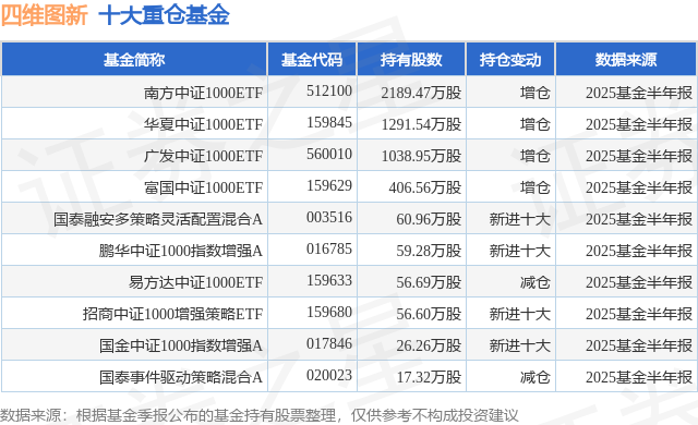根据2025基金半年报公募基金重仓股数据,重仓该股的公募基金共17家,其中持有数量最多的公募基金为南方基金的南方中证1000ETF。南方中证1000ETF目前规模为649.53亿元,最新净值2.9818(10月14日),较上一交易日下跌1.95%,近一年上涨32.74%。该公募基金现任基金经理为崔蕾。崔蕾在任的基金产品包括:南方中证申万有色金属ETF发起联接A,管理时间为2019年7月12日至今,期间收益率为176.74%;南方中证申万有色金属ETF,管理时间为2019年7月12日至今,期间收益率为186.89%;南方红利低波50ETF,管理时间为2020年1月17日至今,期间收益率为92.39%。