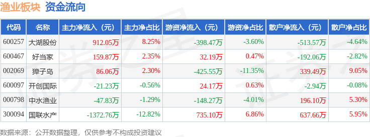 从资金流向上来看,当日渔业板块主力资金净流出283.84万元,游资资金净流出180.84万元,散户资金净流入464.68万元。渔业板块个股资金流向见下表: